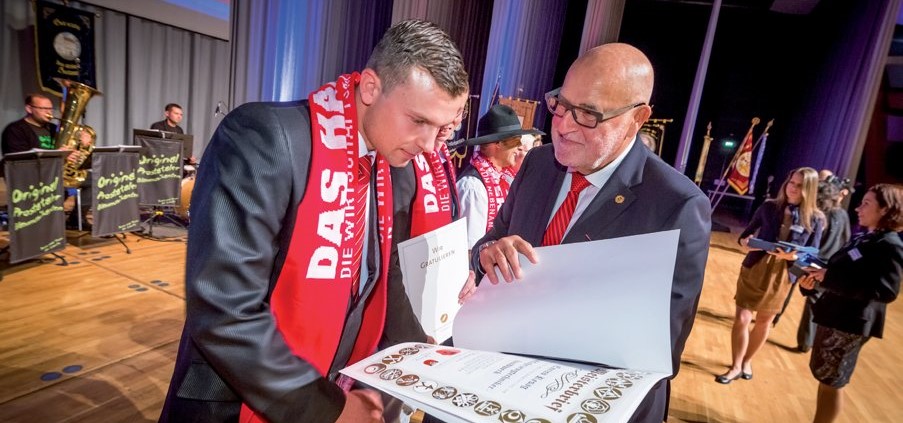 Peter Dreißig übergibt in der Cottbuser Stadthalle einen Meisterbrief an einen lehrgangsbesten Jungmeister. Meister sind diejenigen, die besonders für eine Unternehmensnachfolge im Handwerk in Frage kommen. - Foto: Tino Schulz/HWK Cottbus