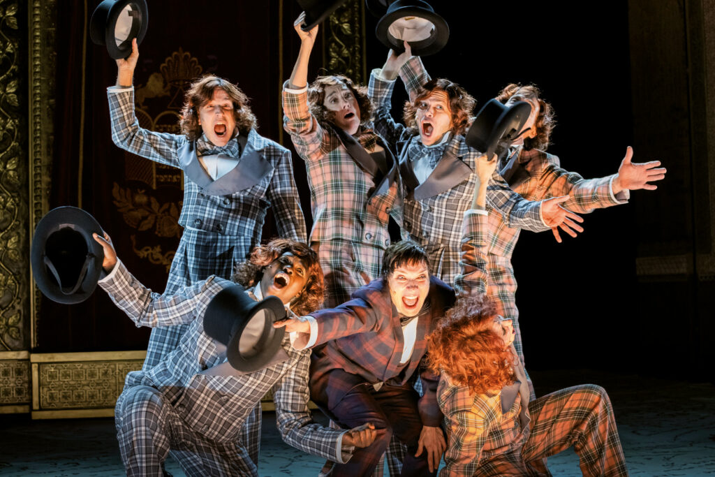 Szenenfoto mit: (Bildmitte) Kate Farley (Aschenbrödel) und Jorge Concepción Leal (George, der junge Mann) sowie Ensemble. Foto: Bernd Schoenberger