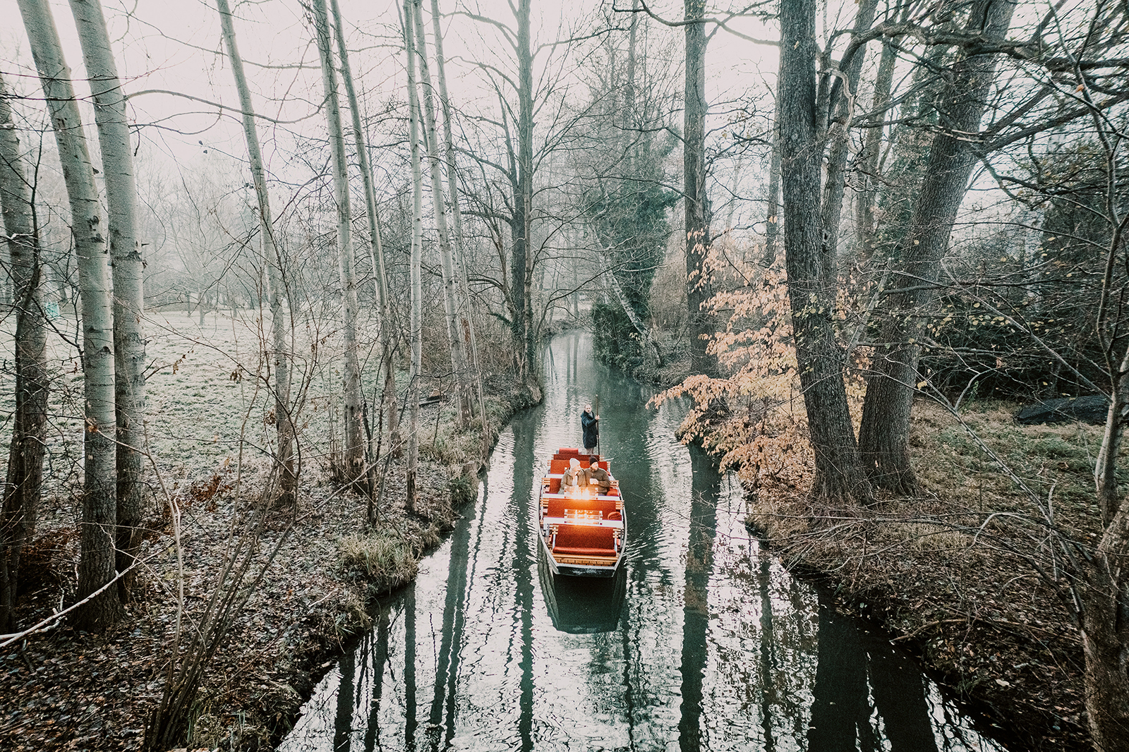 Spreewald ohne Kahnfahrt ist wie Weihnachten ohne Tannenbaum. Und so gibt es von November bis März an ausgewählten Häfen die beliebten Glühweinkahnfahrten, wie die Winterkahnfahrten genannt werden. Kuscheldecken und heiße Getränke sind an Bord. Besonders romantisch sind die Kaminfahrten, die in Burg und Lübben starten und nach rund eineinhalb Stunden auch dort wieder ankommen. Zur Jahreszeit passend gibt es verschiedene Themenkahnfahrten, es wird sagenumwoben, mythisch oder gar kriminell. Die Cottbuser Krimi-Autorin Franziska Steinhauer liest am 2. und 3. Advent auf dem Weihnachts-Krimi-Kahn. Dabei bietet der Spreewald alle Zutaten für eine schaurige Tour: Es ist mucksmäuschenstill, die Äste der kahlen Bäume skizzieren allerlei Wesen, manchmal touchiert ein Ast den Kahn, auf dem an jedem Tisch ein Kaminfeuer brennt. Frieren braucht niemand, aber gespenstisch kann es schon werden, denn bei Franziska Steinhauer geht es schnell hart zur Sache. Meist bleibt es nicht bei einem Toten … Wer die winterliche Stille ganz pur genießen will: Die Glühweinfahrten können individuell gebucht werden.