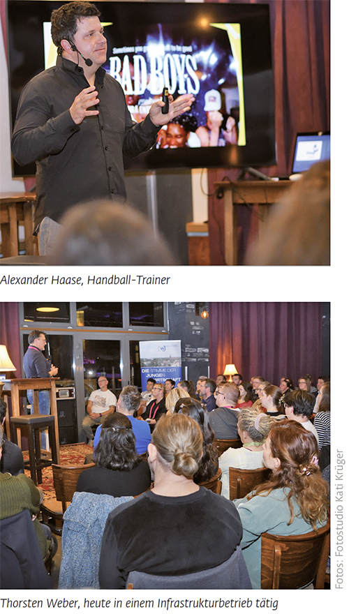 Prominentester Akteur des Abends war Alexander Haase, der von 2014 bis 2019 Co-Trainer der Handball-Nationalmannschaft war. Zusammen mit Trainer Dagur Sigurdsson führte er die Nationalmannschaft 2016 zum Europatitel und im gleichen Jahr bei Olympia zur Bronzemedaille. An die Erfolge konnte die Mannschaft in den Folgejahren jedoch nicht anknüpfen. Bei der EM 2018 scheiterte der Titelverteidiger in der Hauptrunde und bei der Heim-Weltmeisterschaft 2019 belegte sie den undankbaren vierten Platz. In seinem Vortrag führte Alexander Haase Gründe für Erfolg und Mißerfolg der Mannschaft an. Er selbst geriet in ein Burnout und schied aus seinem Amt aus. Heute ist der studierte Gymnasiallehrer Lehrertrainer an der Potsdamer Sportschule und hält Vorträge zum Thema Führung und Teambuilding.